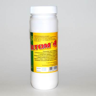 Ветом 4 содержит в качестве действующего вещества живые спорообразующие бактерии вида Bacillus amyloliquefaciensпромышленный штамм ВКПМ В-10643 (DSM 24615)в количестве - не менее 1х106 КОЕ (колониеобразующих единиц) в 1 грамме, а также вспомогательные вещества - сахарную пудру и крахмал.